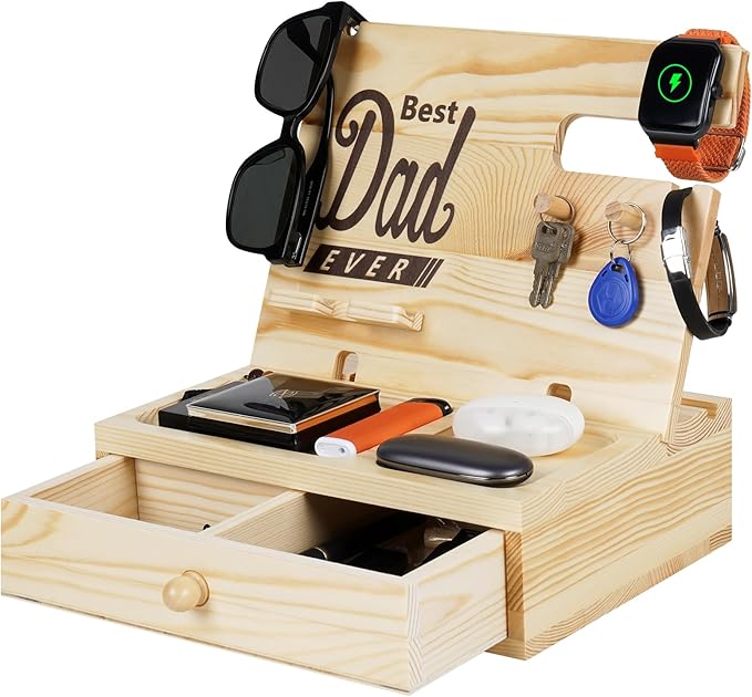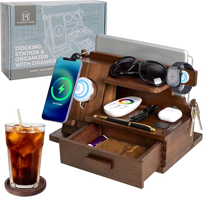 Gifts for Men Christmas Wood Phone Docking Station Desk Accessories Workspace Organizer Birthday Gifts for Men or Dad Nightstand