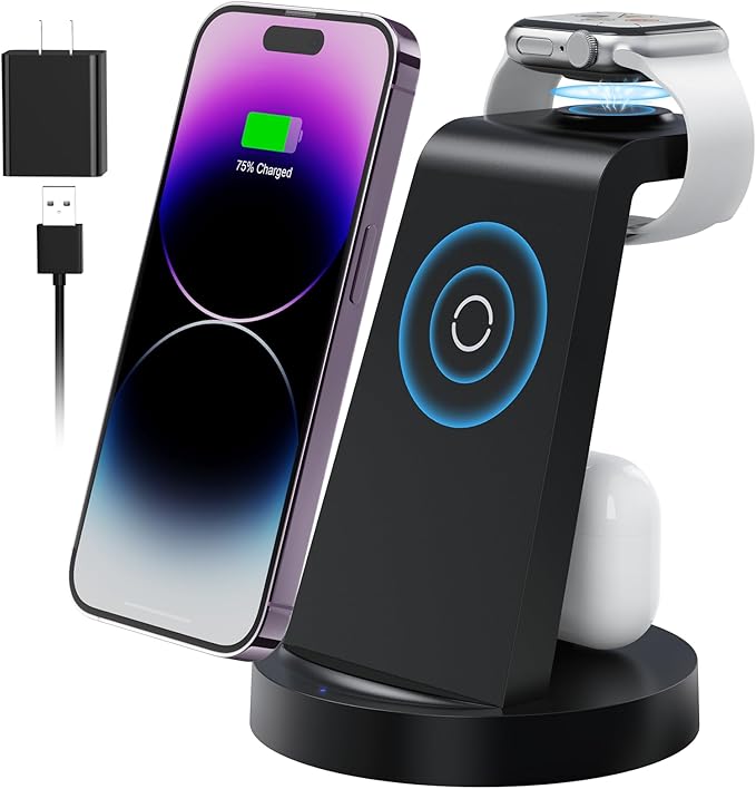 3 in 1 Charging Station for Apple Device, Wireless Charger for iPhone 16 15 14 13 12 11 Pro Max & Apple Watch iwatch- Charging